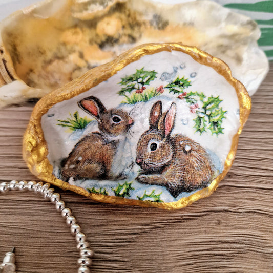 Winter Bunny Rabbits Wildlife Oyster Shell Trinket Dish