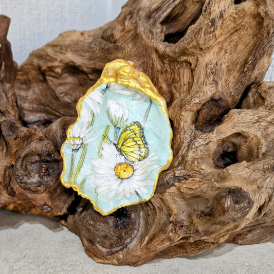Yellow Butterfly Daisy Flower Mint Oyster Shell Trinket Dish