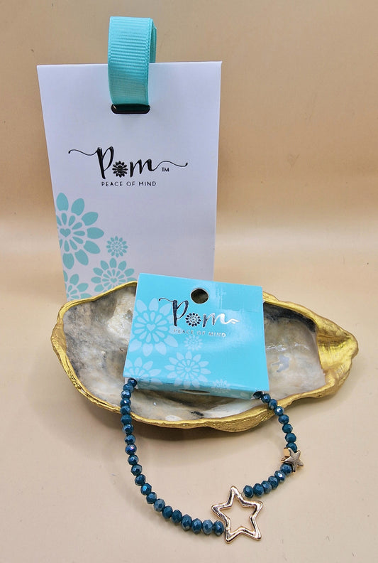 POM Teal Blue Crystal Gold Star Stretch Charm Bracelet