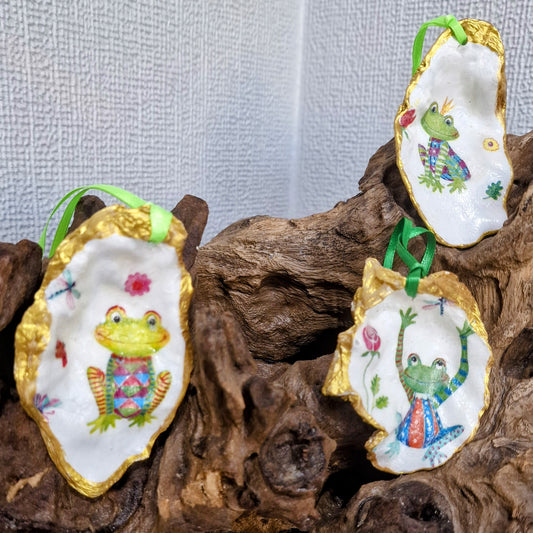 Christmas Ornaments 4 x Funny Frogs Oyster Shell Decoration Ribbon