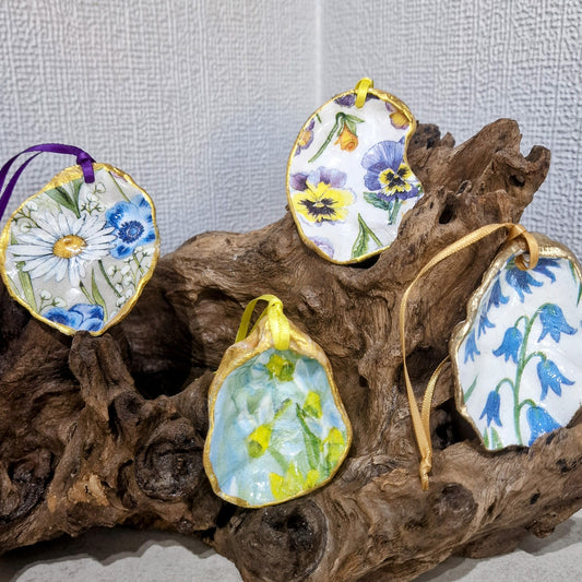 Christmas Ornaments 4 x Floral Flowers Oyster Shell Decoration Ribbon