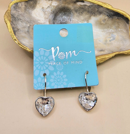 POM Silver Drop Heart Crystal Earrings Pierced Charm Sparkly
