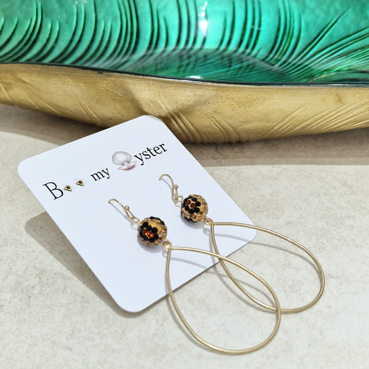 Leopard Print Crystal Ball Pierced Teardrop Hoop Gold Fashion Earrings