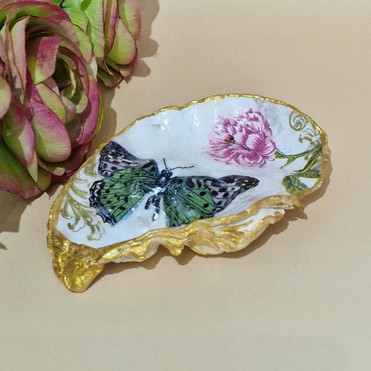 Green Butterfly Rose Flower Oyster Shell Trinket Dish