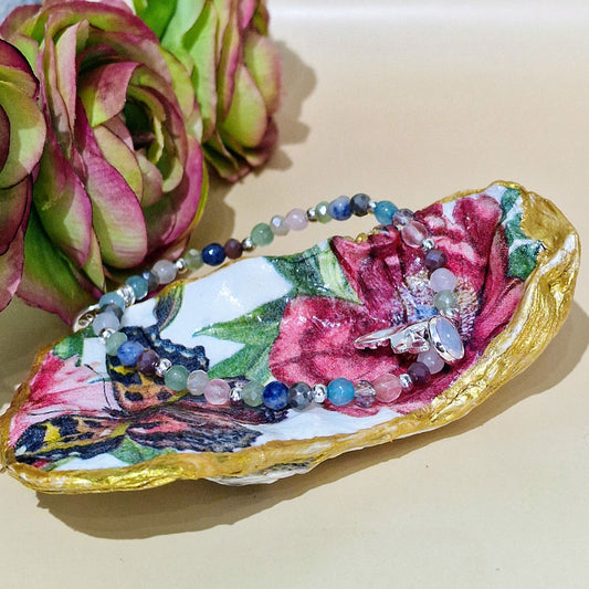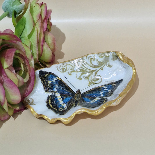 Blue Butterfly Pink Flower Oyster Shell Trinket Dish
