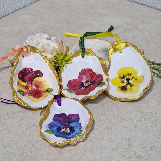 Pansy Flowers Oyster Shell Hanging Ornaments Decorations Gift Easter Tree - Set of 4
