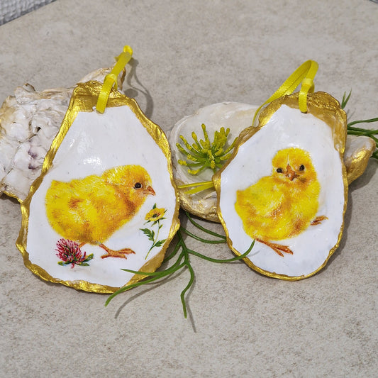 Yellow Easter Chicks Oyster Shell Hanging Ornaments Decorations Gift Tree - Set of 2