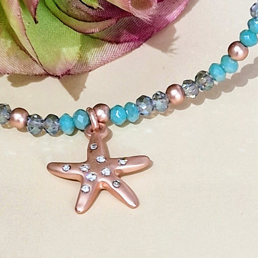 Turquoise Bead with Starfish Charm Rose Gold Stretch Bracelet