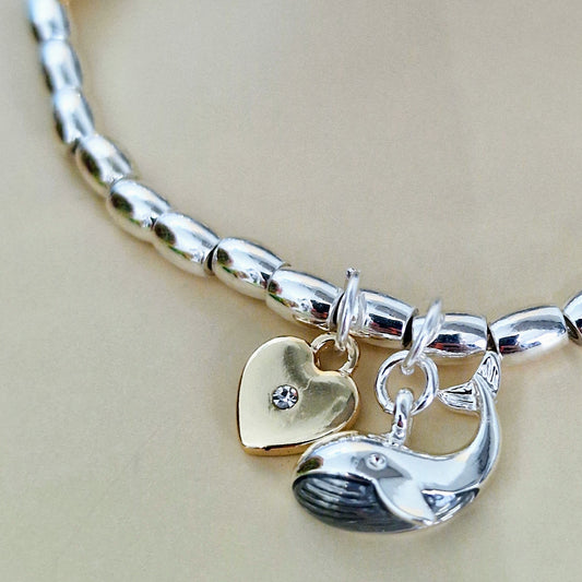 Whale & Heart Crystal Charm Beaded Stretch Bracelet